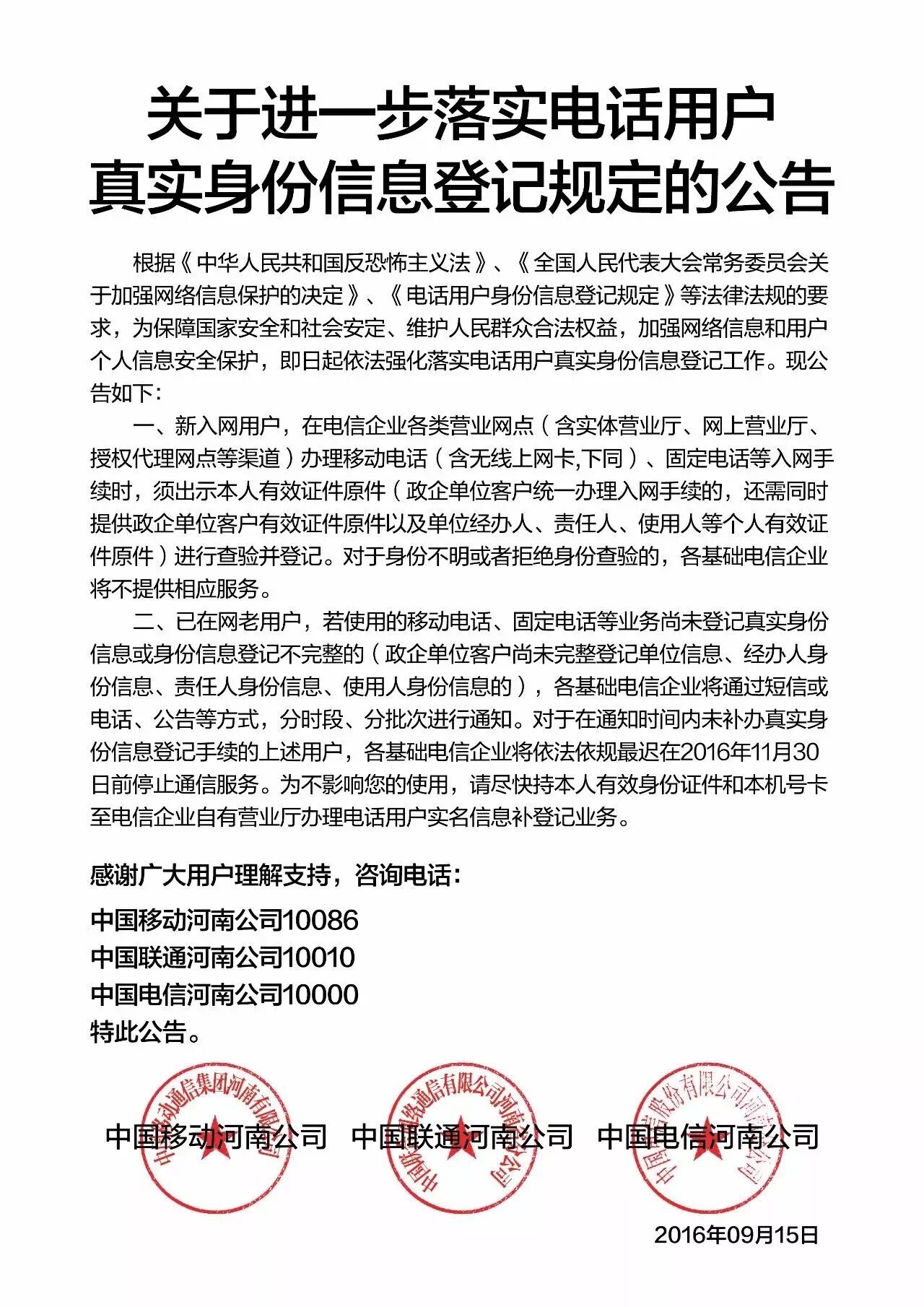 关于进一步落实电话用户真实身份信息登记规定的公告